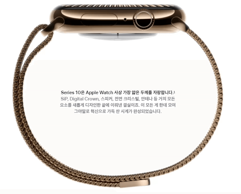 - 애플워치10은 전작 대비 두께가 10% 얇아졌으며, 알루미늄 모델은 10%, 티타늄 모델은 최대 20% 더 가벼워져 착용감이 개선되었습니다.